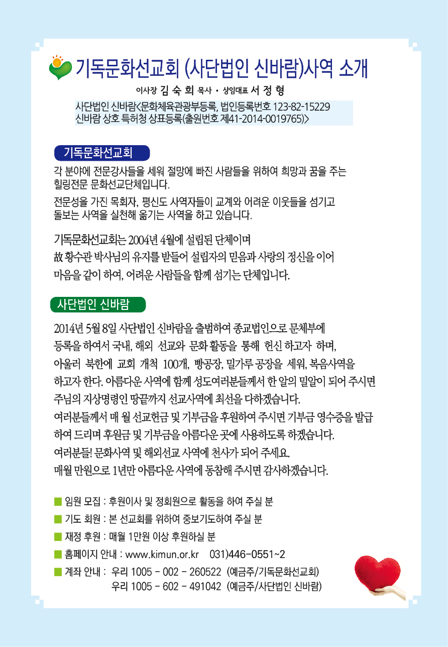 | 2024년 사)기독문화선교회 치유와 회복을 위해 달려 나가요! (0) | 2023.11.21 |