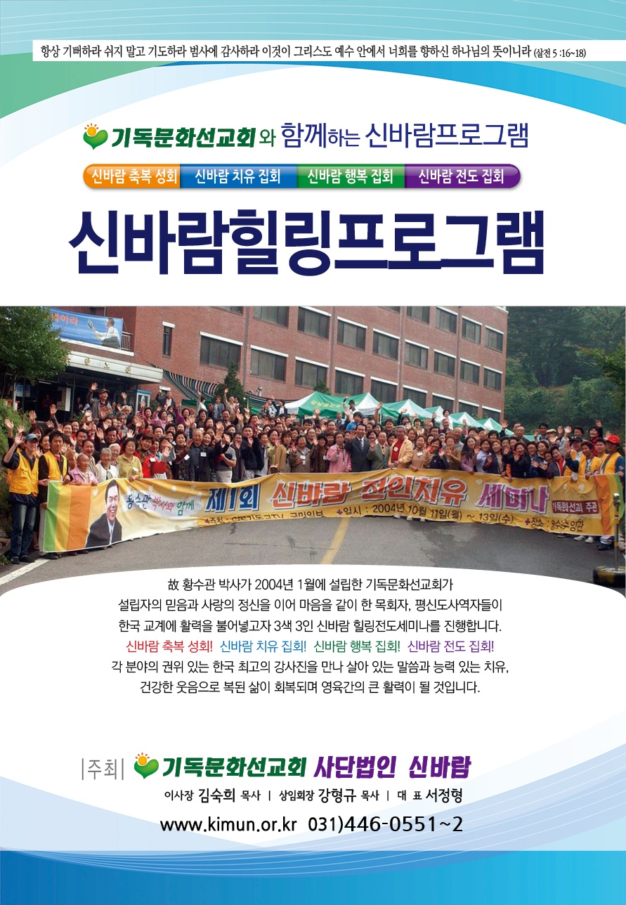 사)기독문화선교회(이사장 김숙희 목사 상임회장 강형규 목사 대표 서정형) 는 펜데믹 이후 회복 되지 못하고 있는 교계와 성도들을 위한 힐링프로그램을 준비 하고자 한다.