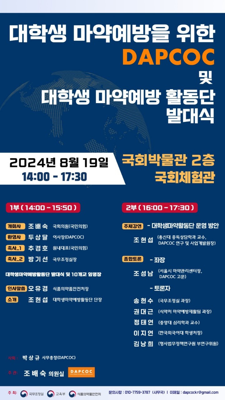 이달 19일(월) 오후2시~5시30분 까지, 국회박물관 2층 국회체험관에서 대학생 마약예방을 위한 DAPCOC 및 대학생 마약예방 활동단 발대식이 있을 예정이다.
