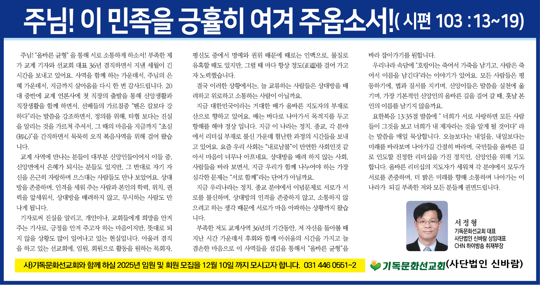 | [칼럼] 서정형 대표 (기독문화선교회 ) (0) | 2024.11.15 |