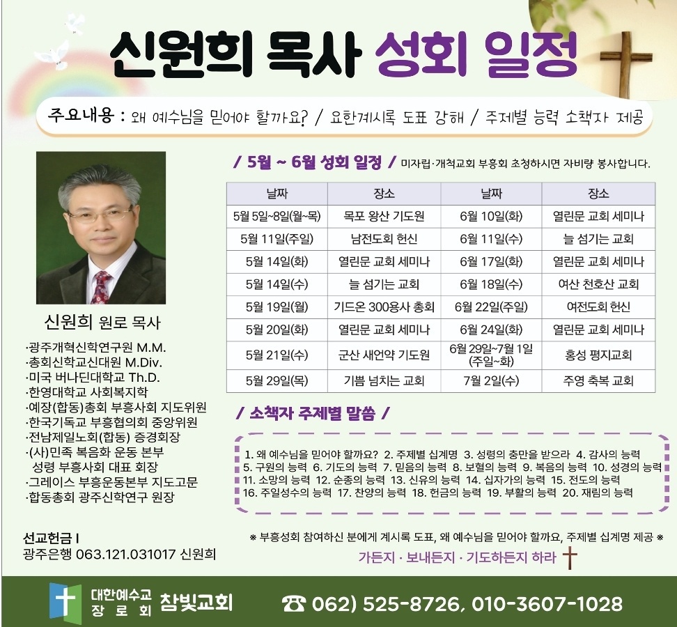 집회는 5월5일~8일 목포 왕상기도원, 21일 군산 새언약기도원, 6월 11일 늘 섬기는교회 외 교회와 기도원 집회를 인도한다.
