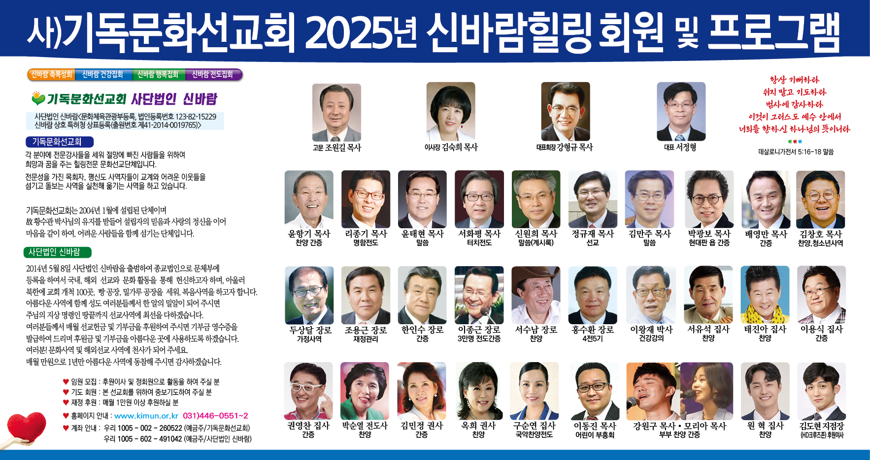 (사)기독문화선교회가 ‘교계의 영적 회복을 위한 마중물 역할과 디딤돌 사명을 다하자’는 목표를 가지고 2025년을 달려가고자 한다. (사)기독문화선교회(이사장 김숙희 목사, 대표회장 강형규 목사, 상임대표 서정형)는 2025년에도 교계와 성도들을 위한 문화선교 사역, 치유와 회복을 위해 섬김을 계속해 나갈 예정이다. 기독문화선교회 서정형 대표는 “새해에는 지난날의 모든 일들을 하루빨리 잊고, 새로운 마음과 각오, 성숙한 생각과 가치관, 모두가 함께라는 공동체 의식을 갖고 한 걸음씩 나아가길 소망한다”고 전했다. 이어 “이제는 주 안에서 모두가 한마음 한 뜻이 되어 예배를 통해 교회 회복, 전도 회복, 교회의 이미지 쇄신을 위한 다양한 프로그램을 통해 희망을 되찾고자 한다. 더불어 회복되지 못하고 있는 교..