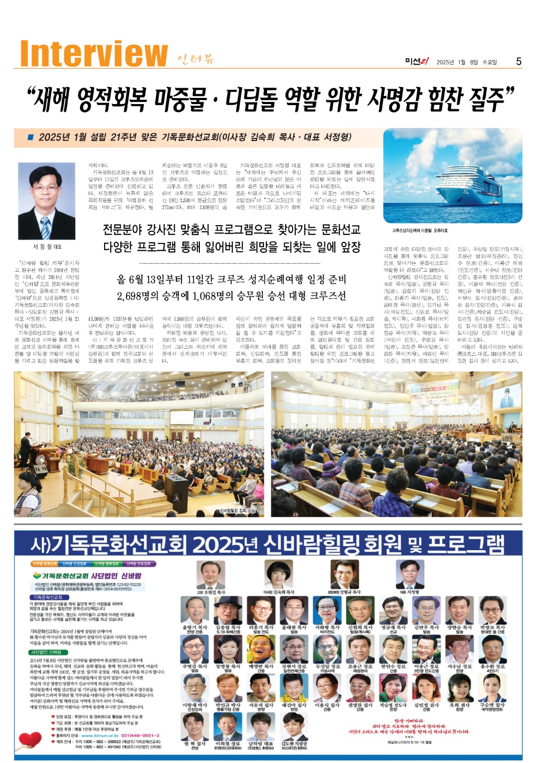 사)기독문화선교회(이사장 김숙희 목사 상임대표 서정형)는 24일 강형규 목사를 단체 대표회장으로 추대했다. 기독문화선교회 상임회장과 회원으로 선교회를 섬기며 활동 하는 중에, 이번에 대표회장에 추대 되었다. 강형규 목사는 연세대학교 연합신학대학원, 백석대 실천신학대학원(Th.M), 미국 헤필드대 (Th.D)에서 수학하고, 백석 총회 부흥사 대표회장, 경추노회 노회장등을 역임 했으며, 백석총회 세계선교위원회 이사장, 새싹사랑나눔 장학회장, 예수사역선교회 총재, 브링업 인터내셔널 운영이사, 기독문화선교회 상임회장 등을맡고 있다. 신천장로교회는 예장 백석 교단이며, 1993년도에 설립 된 선교와 나눔의 사역을 실천에 옮기고 있는 건강한 교회이다. 아울러 필리핀에 지교회 5개 교회를 섬기고 있다. 한 영혼을 소..