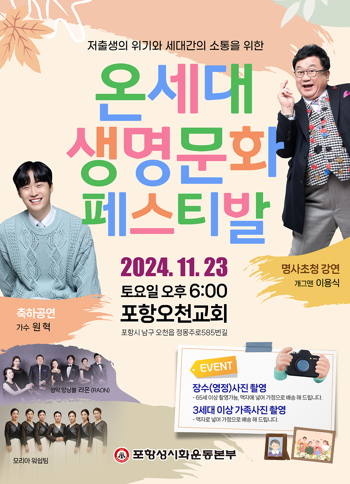 강원도 원주시 북원로 2115 중부교회(김미열 목사)는 11월 24일 (주일)교회 본당에서 원주 시민의 행복을 위한 2024 "관계전도초청 축제 " 의 시간을 가진다. 2부,3부 강사로 개그맨 표인봉 목사, 4부 이종현 찬양 사역자 , 5부 저녁 국민가수 송대관 집사의 시간이 진행 된다. 원주 중부교회는 대한예수교장로회 (합동)강원노회에 소속된 교회로서, 청교도적인 개혁신앙과 하나님의 말씀인 성경을 삶의 터전으로 삼고 복음전도와 제자 훈련에 전심전력 하는 원주지역의 대표적인 교회이다. 중부교회의 비전은 세계에 선교하는 교회, 민족을 전도하는 교회, 가정을 세우는 교회, 평신도 사역하는 교회, 일꾼을 양육하는 교회, 영성을 주도하는 교회로 지역을 섬기고 있으며, 사명, 제자도, 복음전도, 예수그리스도, ..