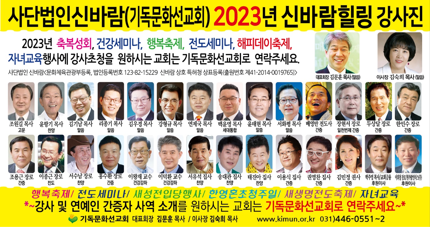 기독문화선교회 신바람힐링집회로 전국순회 예정 기독문화선교회(대표회장 김문훈목사 이사장 김숙희목사)는 하반기 신바람힐링집회로 전국교회를 순회한다. 9월17일 남양주아름다운교회(방호경목사)개그맨 이용식 집사가, 성남 든든한교회(손충만목사)배영만전도사, 10월15일 경기 광주양무리교회(양한승목사)개그맨 배영만전도사, 10월20일 수원서부교회(이준호목사) 탤런트 한인수장로, 10월22일 서대구제일교회(강승구목사) 개그맨 이용식집사, 대구관문교회(박대민목사) 한인수장로, 10월30일 -11월1일까지시흥시 신천장로교회(강형규목사)탤런트 김민정 권사, 배영만전도사, 서유석집사의 집회가 진행되며, 12월3일 남양주 아름다운교회(방호경목사)국민가수 태진아 집사의 간증이 진행된다, 아울러 기독문화선교회 서정형 대표는 " 코로나로 지친 교계와 성도들을 위하여, 믿음안.. 신바람 뉴스 2023.06.29