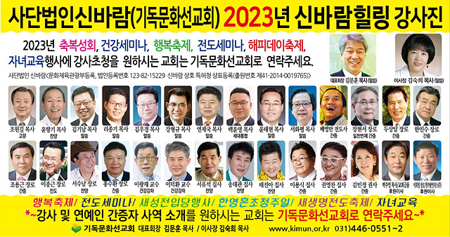사단법인 신바람 2024년 임원 및 회원 추대 예정 사단법인 신바람(이사장 김숙희, 상임대표 서정형)는 2024년4월 설립 20주년에 따른 임원진 및 회원을 추대 하고자 한다. 2004년4월에 고 황수관박사께서 설립하신 기독문화선교회가 어느덧 내년4월이면 설립 20주년이 된다. 법인 목적 사업에 따른 ,선교사업, 문화사업 , 등 다양한 문화활동을 통해 , 국내외 와 아울러 북한선교를 위해, 임원진 중 총재, 대표회장, 회원, 후원이사 등 목회자 및 평신도 사역자를 추대 하고자 한다. 접수기간은 2023년 8월 30일 예정이며, 아울러 선교회 임원진 및 회원 가입에 따른 안내는 기독문화선교회로 신청 받는다. 031 446 0551~2 신바람 뉴스 2023.07.04