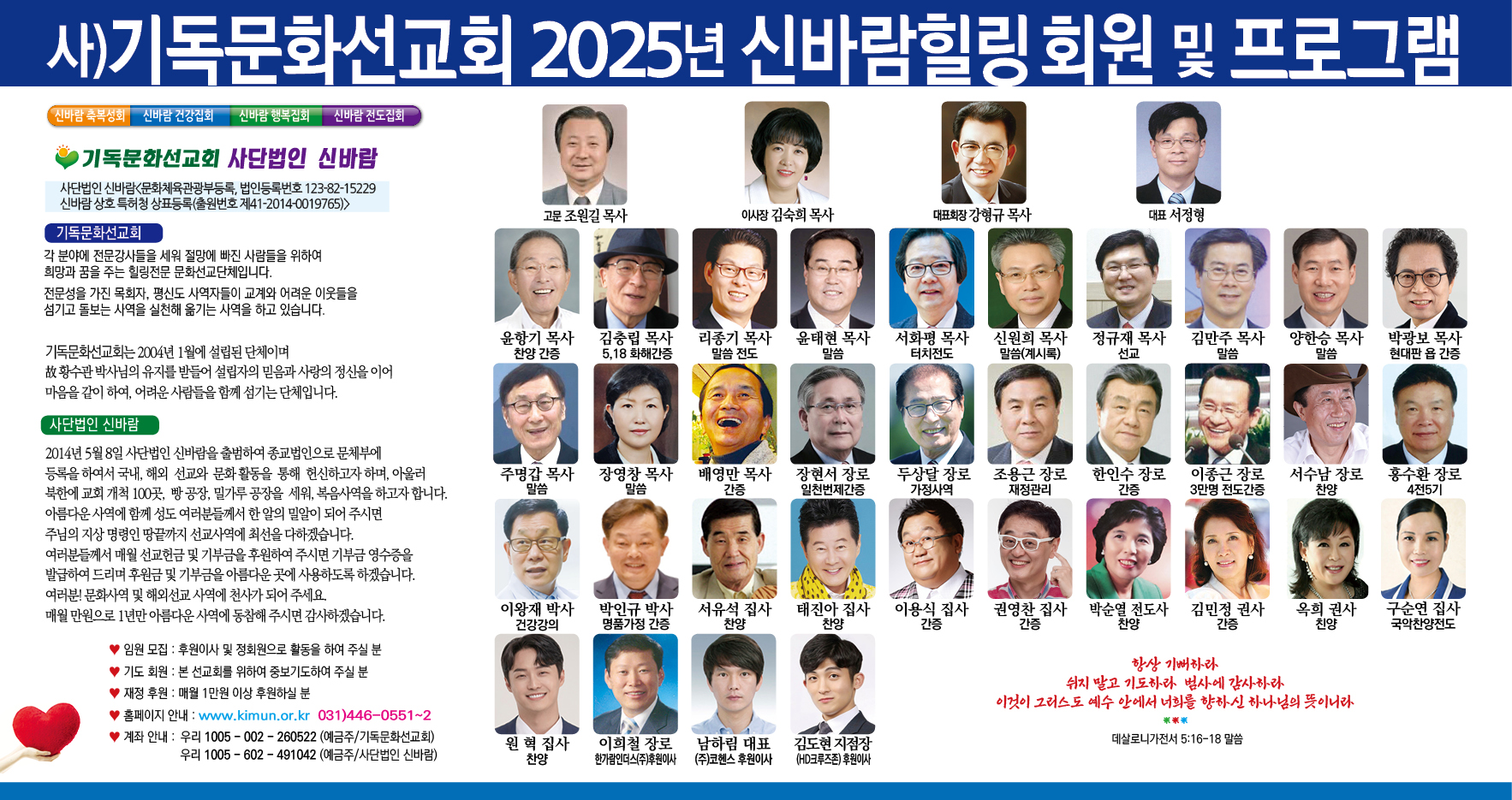 사)기독문화선교회(이사장 김숙희 목사 상임대표 서정형)는 24일 강형규 목사를 단체 대표회장으로 추대했다. 기독문화선교회 상임회장과 회원으로 선교회를 섬기며 활동 하는 중에, 이번에 대표회장에 추대 되었다. 강형규 목사는 연세대학교 연합신학대학원, 백석대 실천신학대학원(Th.M), 미국 헤필드대 (Th.D)에서 수학하고, 백석 총회 부흥사 대표회장, 경추노회 노회장등을 역임 했으며, 백석총회 세계선교위원회 이사장, 새싹사랑나눔 장학회장, 예수사역선교회 총재, 브링업 인터내셔널 운영이사, 기독문화선교회 상임회장 등을맡고 있다. 신천장로교회는 예장 백석 교단이며, 1993년도에 설립 된 선교와 나눔의 사역을 실천에 옮기고 있는 건강한 교회이다. 아울러 필리핀에 지교회 5개 교회를 섬기고 있다. 한 영혼을 소..