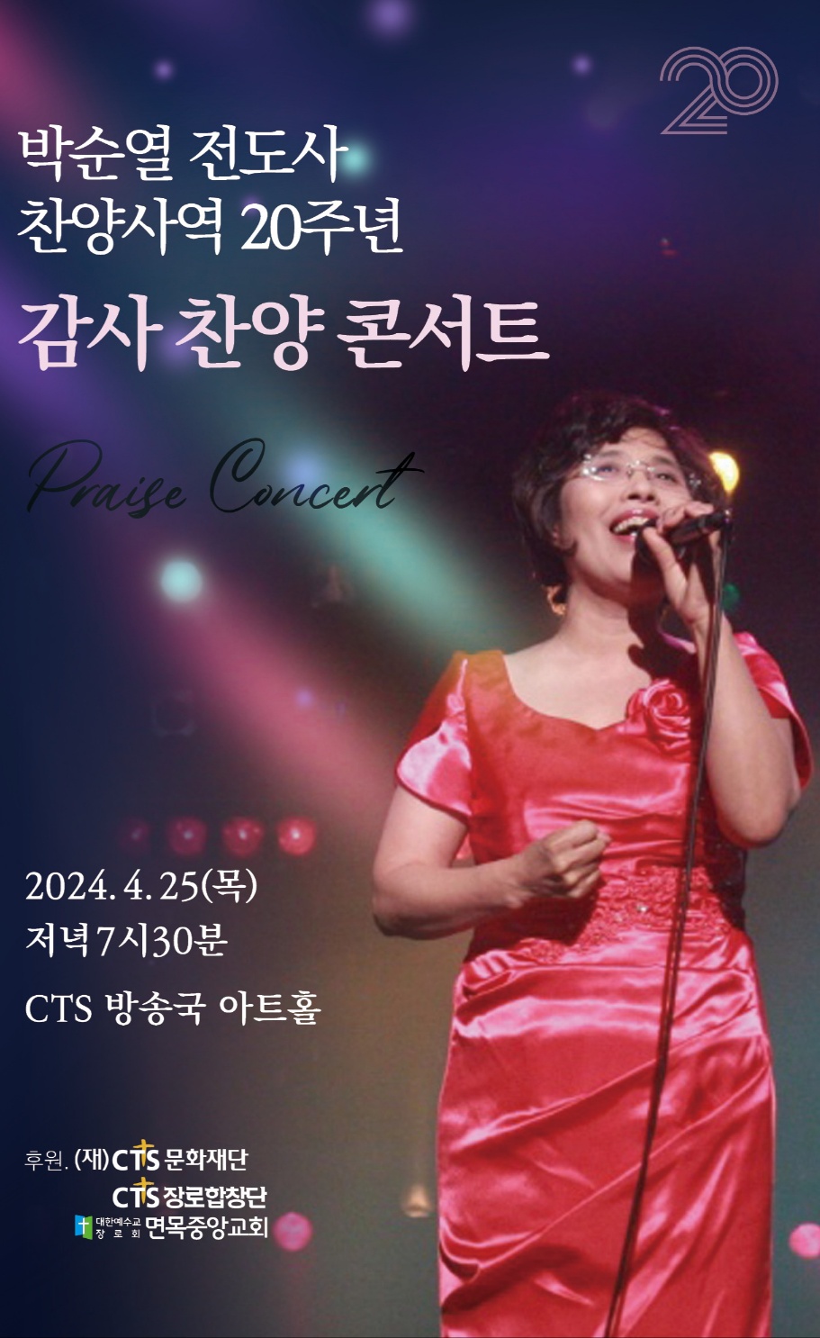 “찬양의 시간을 통하여서 회복과 치유 은혜가 일어나고 있어요” 사)기독문화선교회(이사장 김숙희 목사, 상임회장 강형규 목사 대표 서정형) 는 10일 찬양 사역자 박순열 전도사를 신바람힐링 강사로 위촉 하였다. 박순열 전도사(면목중앙교회)는 올 해가 찬양사역 20주년 되어서, 지난 4월 25일(목) 저녁 7시 30분에 CTS방송국 아트홀에서 사역 20주년 기념 콘서트의 시간을 가졌다. 이 날 박 전도사는 “ 부족한 저에게 , 주님을 찬양 할 수 있는 , 사명을 주신 하나님을 찬양하며, 일어나라 빛을 발하라, 라는 아름다운 선율의 찬양을 중심으로 은혜를 나누는 귀한 시간들을 가지게 되었다. 박순열 전도사는 , 제가 섬기는 면목중앙교회에서 신앙생활을 벌써 올해가 48년이 다 되었네요. 지난 세월들을 뒤 돌아..