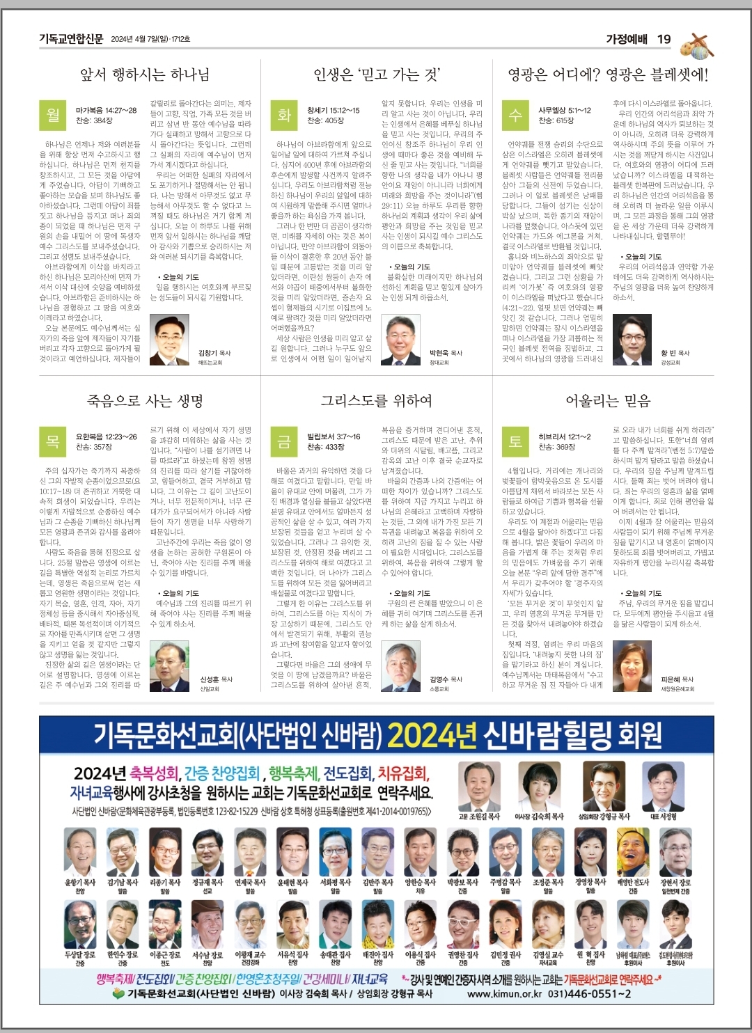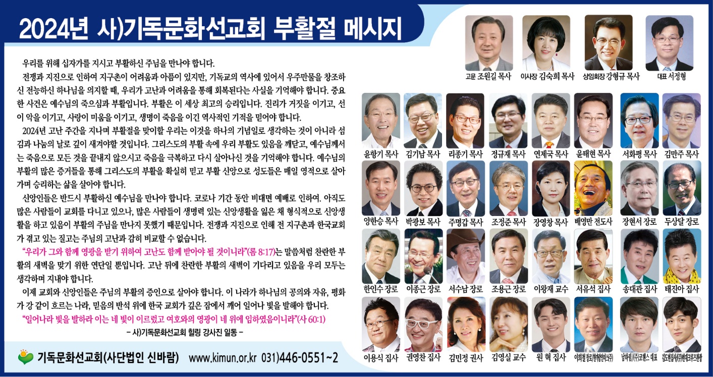 사)기독문화선교회(이사장 김숙희 목사 상임회장 강형규 목사 대표 서정형)는 30일 ‘우리를 위해 십자가를 지시고 부활하신 주님을 만나야 합니다’라는 제목으로 2024년 부활절 메시지를 발표했다. 선교회는 메시지에서 “2024년 부활절에는 교계와 신앙인들은 주님의 부활의 증인으로 살아야 한다”고 강조했다. 또 “이 나라가 하나님의 공의와 자유, 평화가 강같이 흐르는 나라, 믿음의 반석 위에 한국교회가 깊은 잠에서 깨어 일어나 빛을 발해야 한다”고 했다. 다음은 부활절 메시지 전문이다. 우리를 위해 십자가를 지시고 부활하신 주님을 만나야 합니다 전쟁과 지진으로 인하여 지구촌이 어려움과 아픔이 있지만, 기독교의 역사에 있어서 우주만물을 창조하신 전능하신 하나님을 의지할 때, 우리가 고난과 어려움을 통해 회복 ..