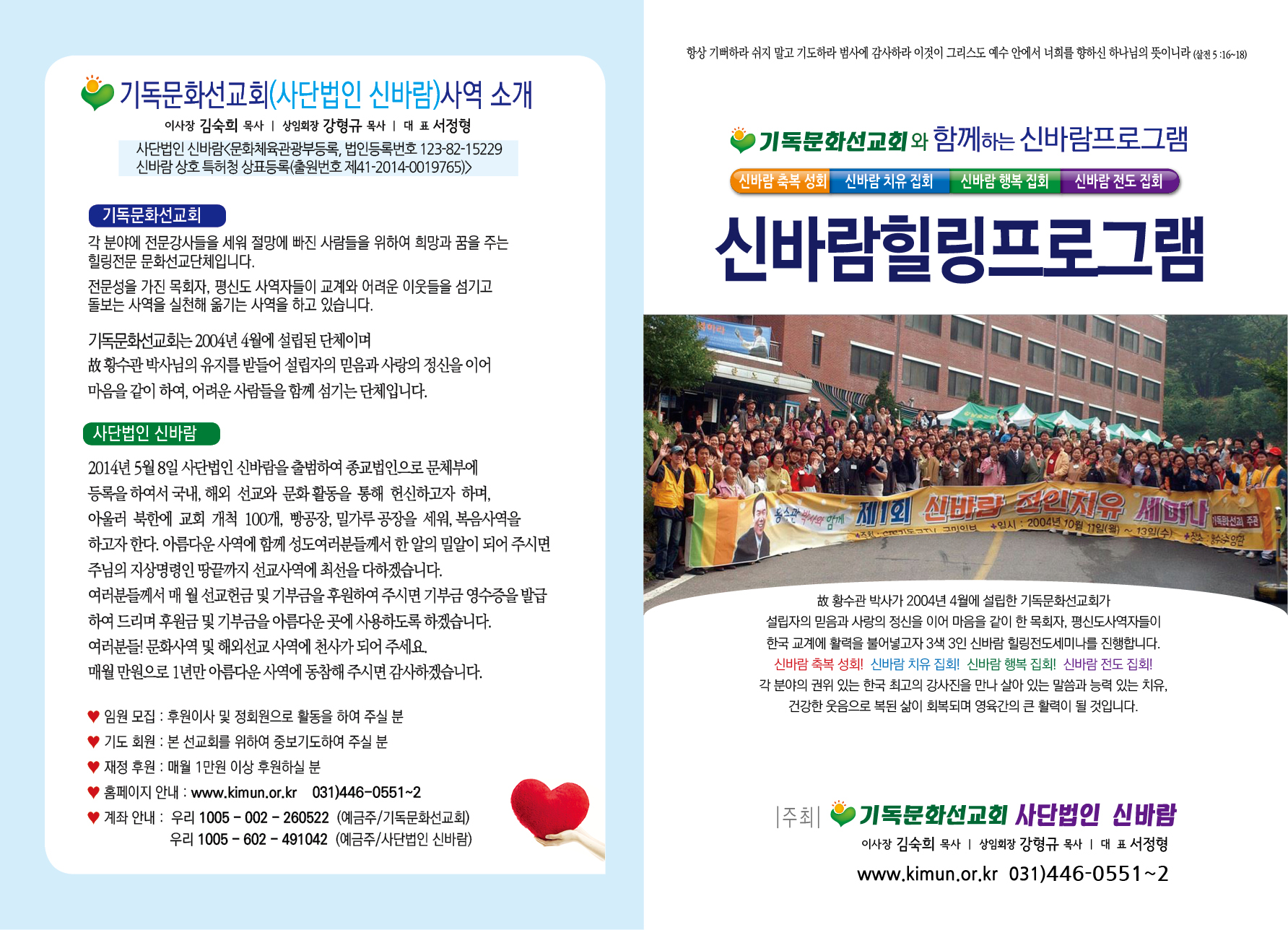 사)기독문화선교회(이사장 김숙희 목사, 상임회장 강형규 목사)는 22일(금) 오전 11시 경기 시흥시 신천장로교회(강형규 목사)에서 , NGO 단체인 브링업인터내셔널(대표 신승철 목사)와 업무 협약을 가질 예정이다. 사)기독문화선교회는 2004년 1월 고 황수관 박사께서 설립한 문화선교 단체이다. 이 단체 서정형 대표는 "이번에 사)기독문화선교회가 설립 20주년 " 이 되어, 그동안 문화 사역을 진행 하였지만, 법인 목적 사업에 국내외,선교와 문화를 통하여, 다양한 문화 행사를 통해서, 준비된 강사진들과 함께, 복음사역을 진행 하고자 한다는 소감을 밝혔다. 아울러 브링업인터내셔널 대표 신승철 목사는 '브링업' 설립에 따른 사역을 소개 하였다. 브링업은 한국의 사단법인이자 국제 NGO 단체로 국제구호, 개..