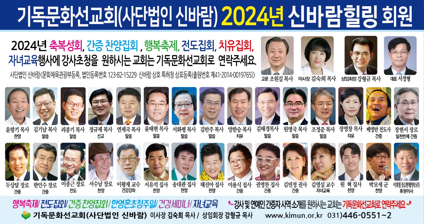 집회, 간증, 전도, 치유, 집회 등 다양한 프로그램으로 방방곡곡 찾아갈 예정 고 황수관 박사가 설립한 사)기독문화선교회(이사장 김숙희 목사, 상임회장 강형규 목사)는 침체된 한국교회에 활기를 더하고 예배회복과 교회성장을 위해 선교회 소속 목회자와 연예인, 전문 강사들이 전국순회성회를 갖는다. 신바람힐링 강사로는 김숙희 강형규 윤항기 김기남 리종기 정규제 연제국 윤태현 서화평 김만주 양한승 조정준 장영창 목사, 배영만 전도사 장현서 두상달 이종근 서수남 한인수 장로, 서유석 송대관 태진아 이용식 권영찬 집사, 이왕재 교수 ,김민정 권사 김영실 교수, 원 혁 집사, 박모세군, 후원이사로는 이희철 장로 등이 참여 하고 있다. 기독문화선교회 서정형 대표는 “포스트 코로나 시대 이후 이제는 회복을 위해 힘든 교..