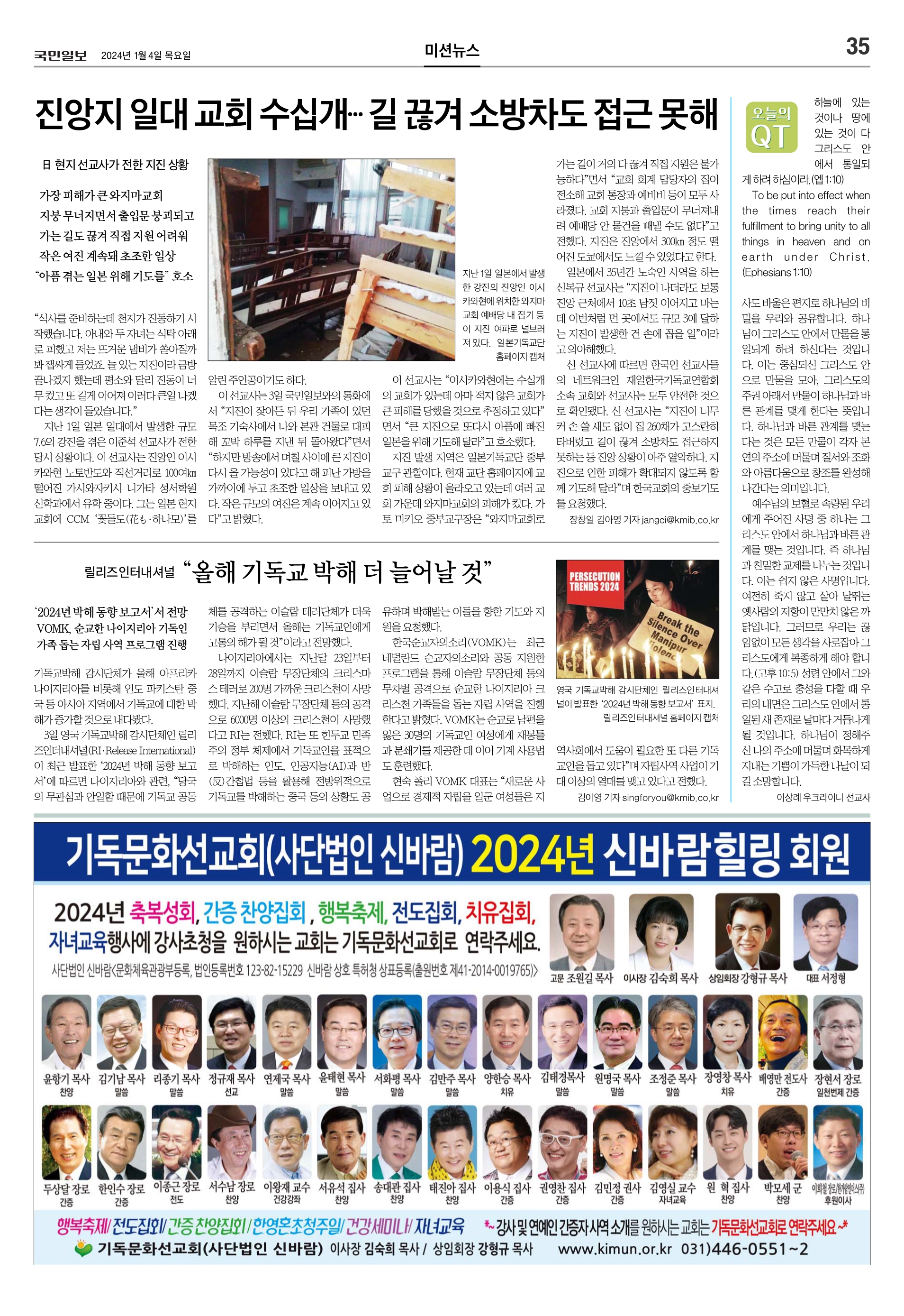 주님! 2024년에는 새해에는 달리다굼하게 하옵소서. 지구촌이 코로나로 인하여 힘든 시기를 보냈으며, 아직도 세계 곳곳이 전쟁중인 가운데 이제는 평화를 통해 모든 분야에서 화합 이루는 달리다굼 하소서. 고민이 물러가고, 아픔이 물러가고, 걱정이 물러가고, 생각이 늘 긍정되게 하소서. 주님! 2024년에는 일상적 생활이 회복되게 하소서. 대면 예배가 회복되고, 얼어붙은 경제가 회복되고, 영육의 건강이 회복되고, 자존감이 회복되게 하소서. 주님! 2024년에는 하나님의 뜻이 하늘에서 이룬 것처럼 이 땅에서 이뤄지게 하소서. 묶인 것이 풀리고, 닫힌 것이 열리고, 막힌 것이 뚫리고, 하나님의 공의와 사랑이 넘쳐나게 하소서. 주님! 2024년에는 믿음과 소망과 사랑의 삶 가운데 나누고 누리게 하소서. 믿음이 더..