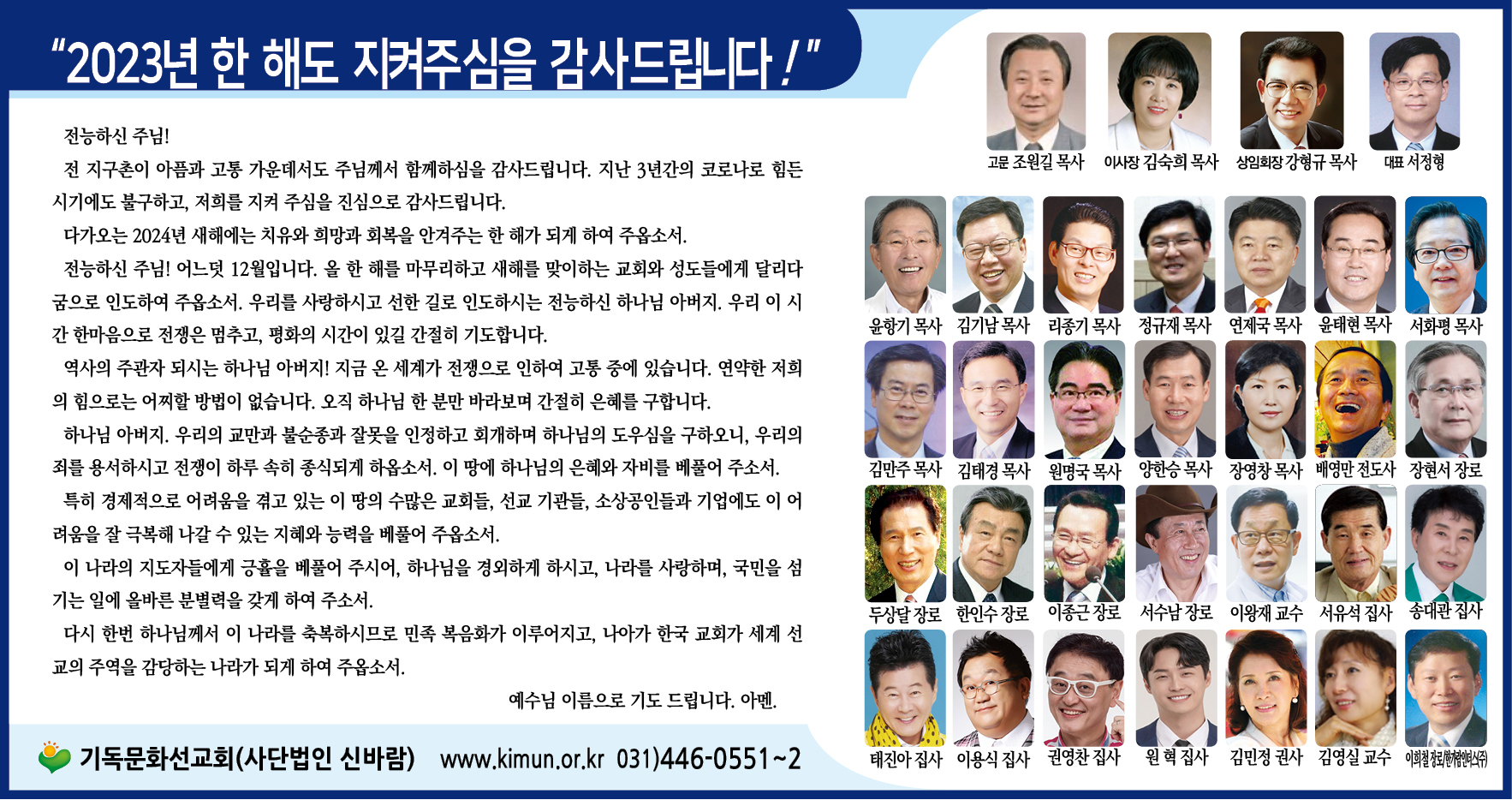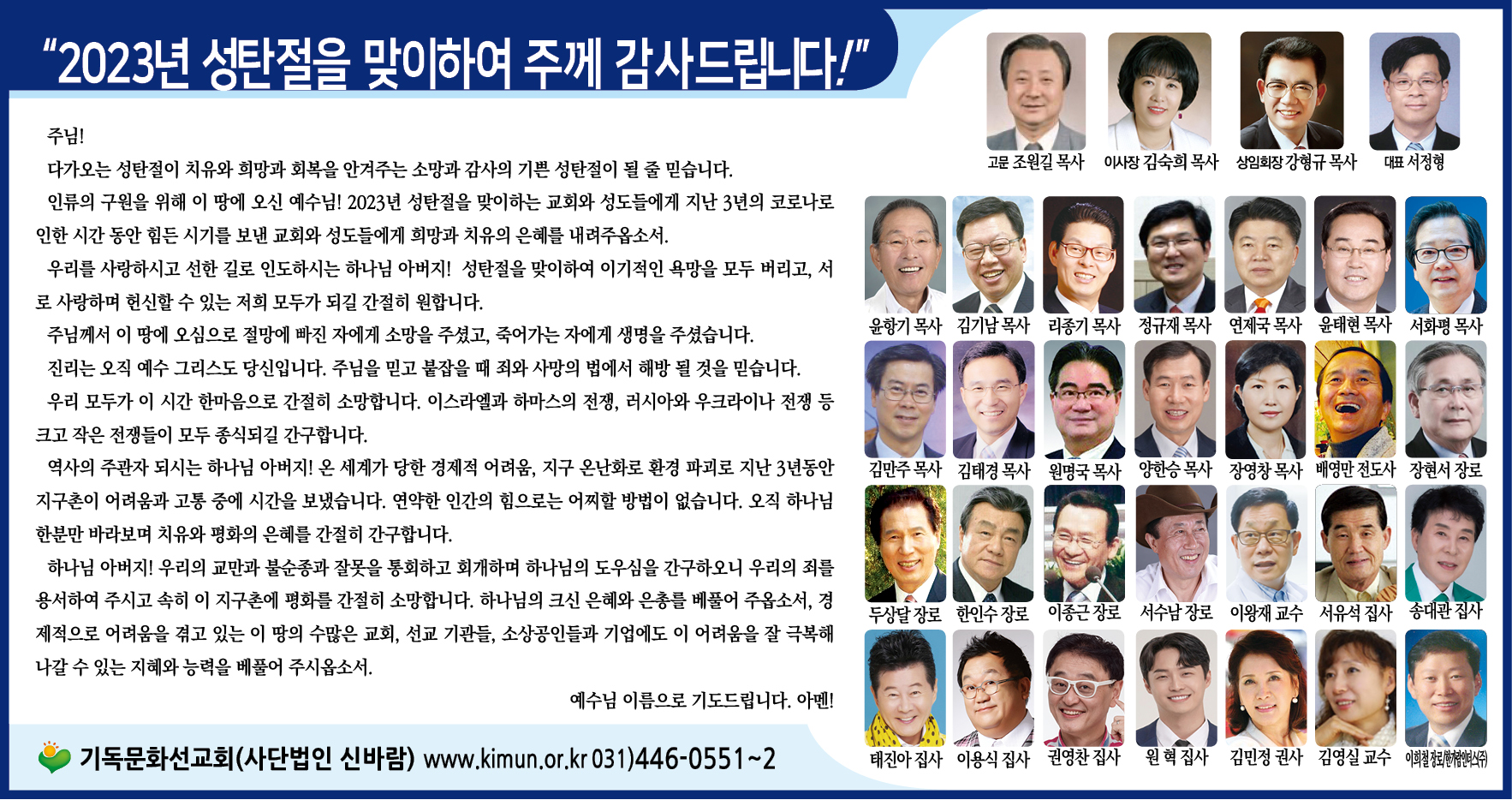 2023년 성탄 메시지 주님! 올 해 성탄절은 치유와 희망과 회복을 안겨주는 기쁜 성탄절이 되게 하여주소서. 인류의 구원을 위해 이땅에 오신 예수님! 이번 성탄절을 맞이하는 교회와 성도들에게 지난 3년의 코로나로 인한 시간동안 힘든 시기를 보낸 교회와 ,성도들에게 희망과 치유의 은혜를 내려주옵소서. 연약한 저희들을 사랑하시고 구원의 길로 인도하시는 주님. 성탄절을 맞이하여 연약한 우리 모두는 이기적인 욕망을 버리고, 서로 사랑하며 헌신할수 있는 저희들이 되길 간절히 소망합니다. 주님은 이땅에 오심으로 인하여, 절망하는 자들에게 소망을 주셨고, 죽어가는 자들에게 생명과 소망을 주셨습니다. 진리는 오직 예수 그리스도 입니다. 주님을 붙잡고 믿을 때 ,죄와 사망의 법에서 해방 될 것을 믿습니다. 이제 우리 모..