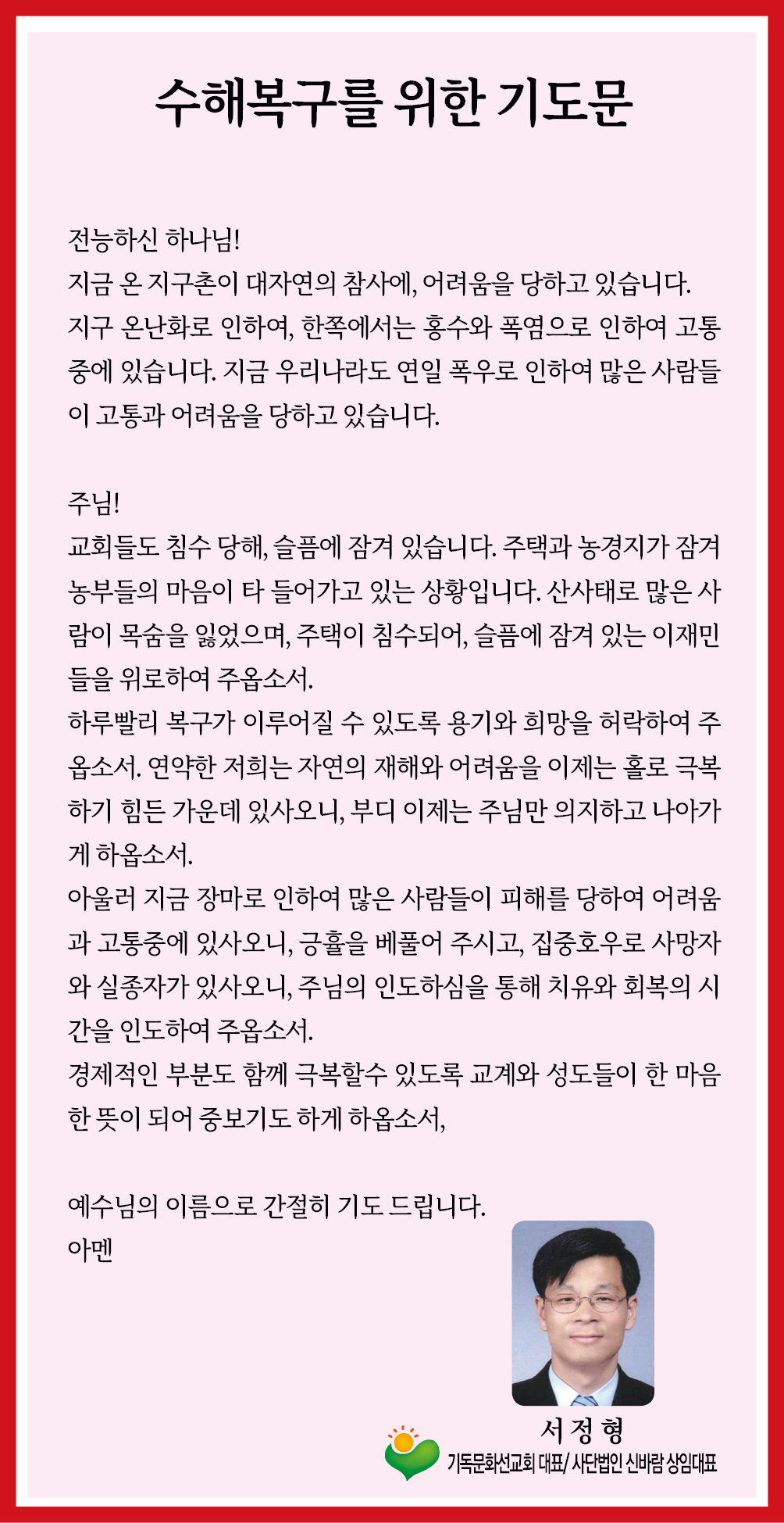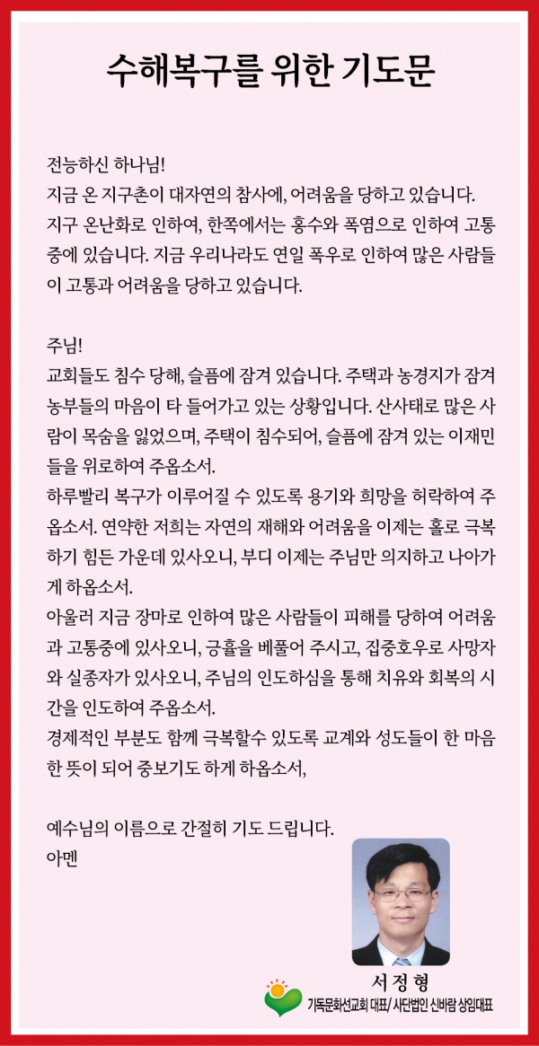[기고]수해 복구를 위한 기도문 서정형 대표 기독문화선교회 전능하신 하나님! 홍수와 폭염으로 인하여 고통 중에 있습니다. 주택과 농경지가 잠겨 농부들의 마음이 타 들어가고 있는 상황입니다. 산사태로 사람들이 목숨을 잃었습니다. 주택이 침수돼 슬픔에 잠겨 있는 이재민들을 위로하여 주옵소서. 하루빨리 복구가 이뤄지고 용기와 희망을 주옵소서. 자연의 재해와 어려움을 홀로 극복하기 힘든 가운데 있사오니, 부디 주님만 의지하고 나아가게 하옵소서. 긍휼을 베풀어 주옵소서. 사망자와 실종자들이 있습니다. 치유와 회복의 시간을 주옵소서. 경제적인 부분도 함께 극복할 수 있도록 한국교회와 성도들이 한 마음 한 뜻이 되어 중보기도하게 하옵소서. 예수님의 이름으로 간절히 기도 드립니다. 아멘.