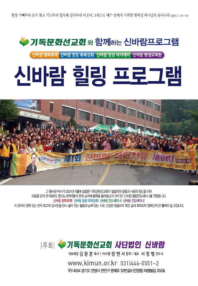 기독문화선교회(대표회장 김문훈 목사·이사장 장현서 장로)는 11일부터 전국교회에서 지역주민 초청 교회별 맞춤 집회를 진행한다. 대표회장 김문훈 목사는 “말씀과 기도로 준비된 강사들의 신바람 나는 은혜의 말씀, 간증과 웃음이 있는 힐링을 통해 기쁨과 행복을 나누는 집회”라고 말했다. 서정형 기독문화선교회 대표는 “교회에서 희망과 기쁨, 감사를 느끼게 하고 삶에 활력을 줄 수 있는 강사진을 우선 소개하고 있다”며 “교회 형편상 재정적으로 어려운 교회는 기업체 후원으로 무료 집회도 진행한다”고 말했다. 일정은 다음과 같다. 11일 여의도순복음 서대문교구(오장용 목사)에서 배영만 전도사, 21일 부천꿈마을엘림교회(김영대 목사)에서 장현서 장로, 세종우리명성교회(김태경 목사)에서 배영만 전도사, 28일 순천신성교..